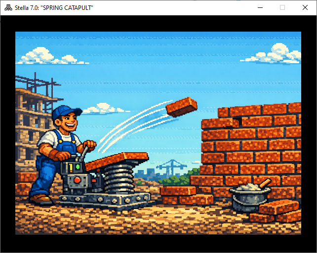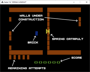 💻Press SELECT to start the game. Hit the brick (fire button) with the spring catapult when both are in the right position and throw it into position to build two walls, one on the left and one on the right. They move independently up and down and you can't stop them. Move the joystick up/down to change the direction of the catapult and right/left to move it and hit the brick in the right direction. You must complete a wall of eight bricks on each side to proceed to the next level. If a brick hits a part of the wall that has already been built, it will collapse and you will have to start over. If you knock down five walls ... game over.